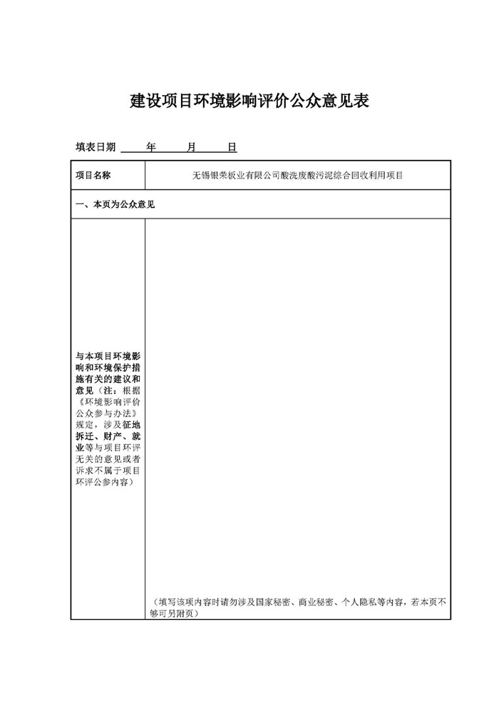 公眾可在本項目環境影響報告書征求意見稿編制過程中,下載建設項目環境影響評價公眾意見表(見附件),填寫后以信函、傳真、電子郵件或者其他便利的方式,向建設單位或者環境影響評價單位提交書面意見或電話咨詢。